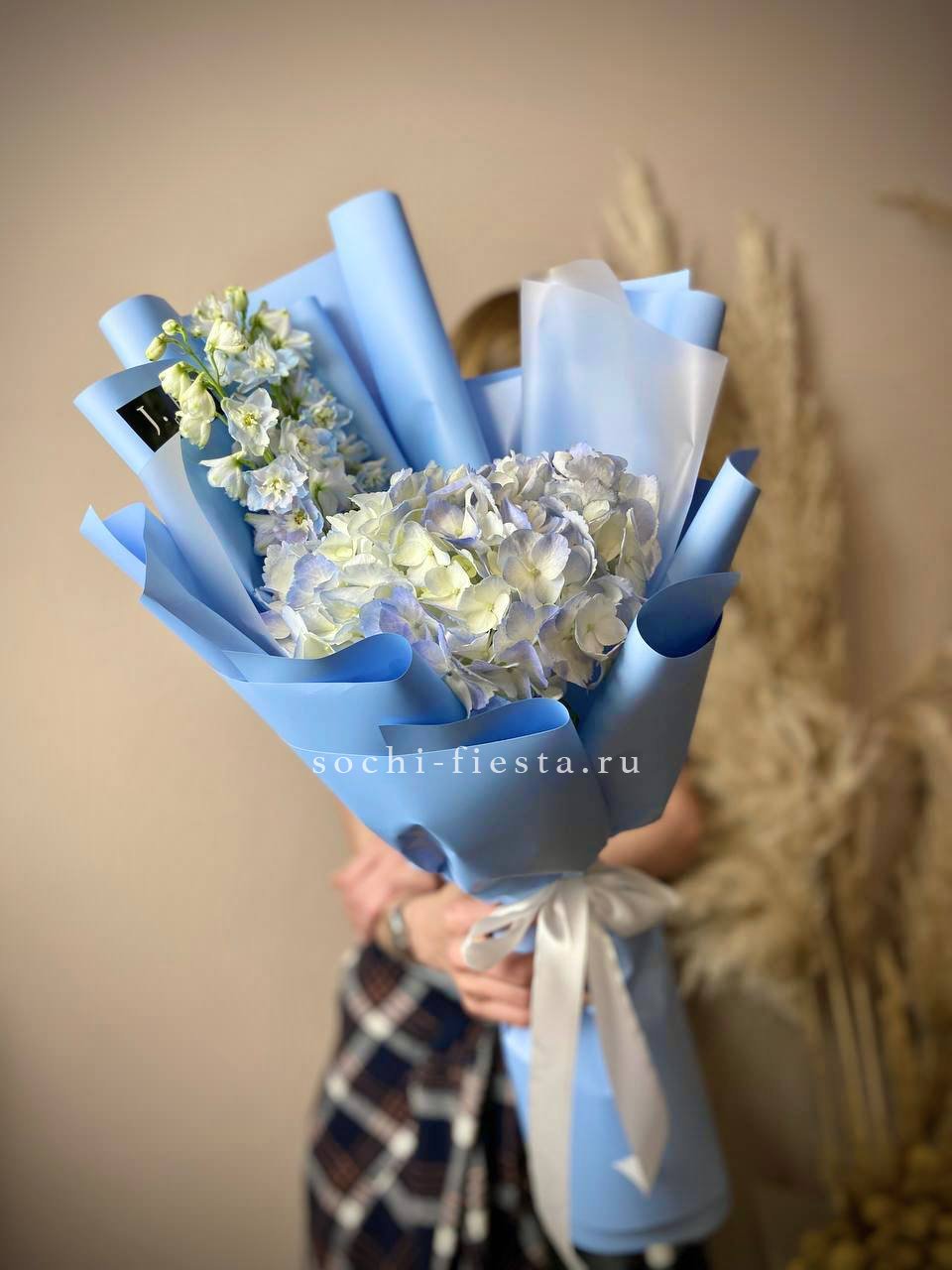 Яркий микс голубых и синих оттенков создает ощущение прохлады и воздуха. Пышные шапки гортензии переплетаются с вертикальными линиями дельфиниума, формируя объемную композицию с выразительным силуэтом.