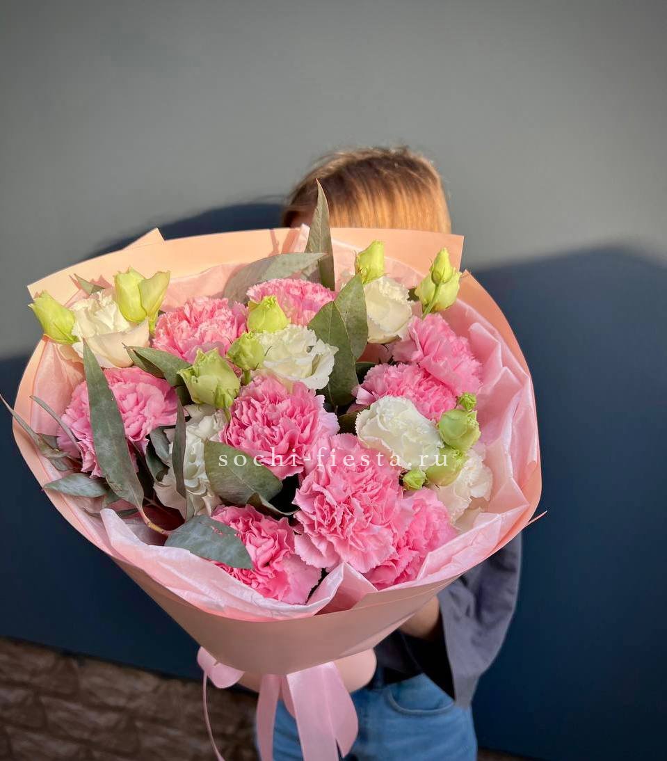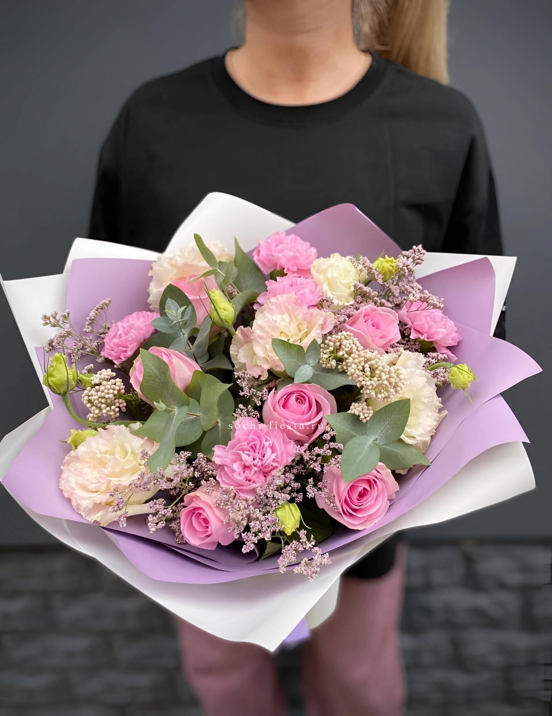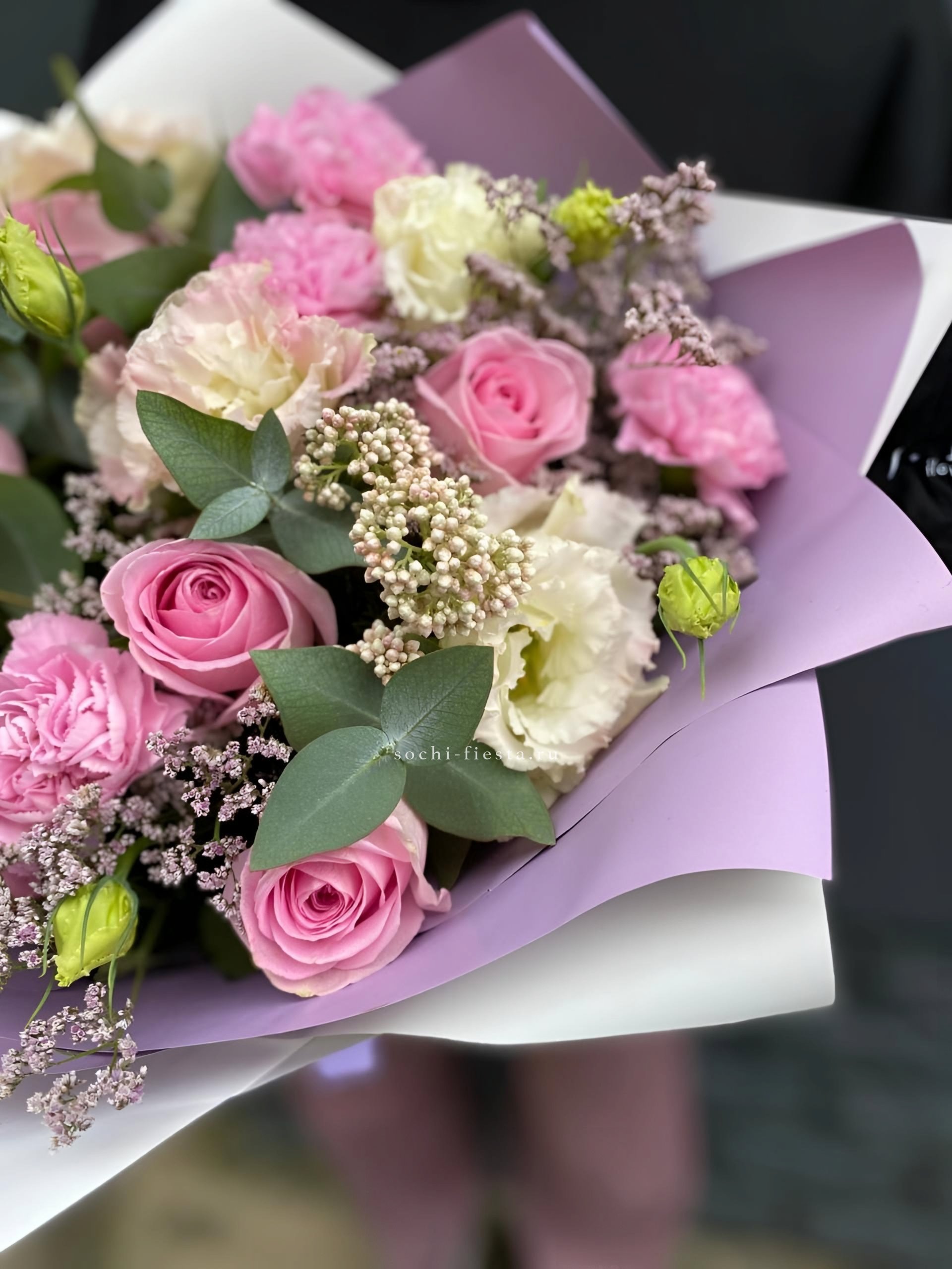 гортензия, гвоздика, статица (или аналог), роза, эустома, дизайнерская пленка, лента.