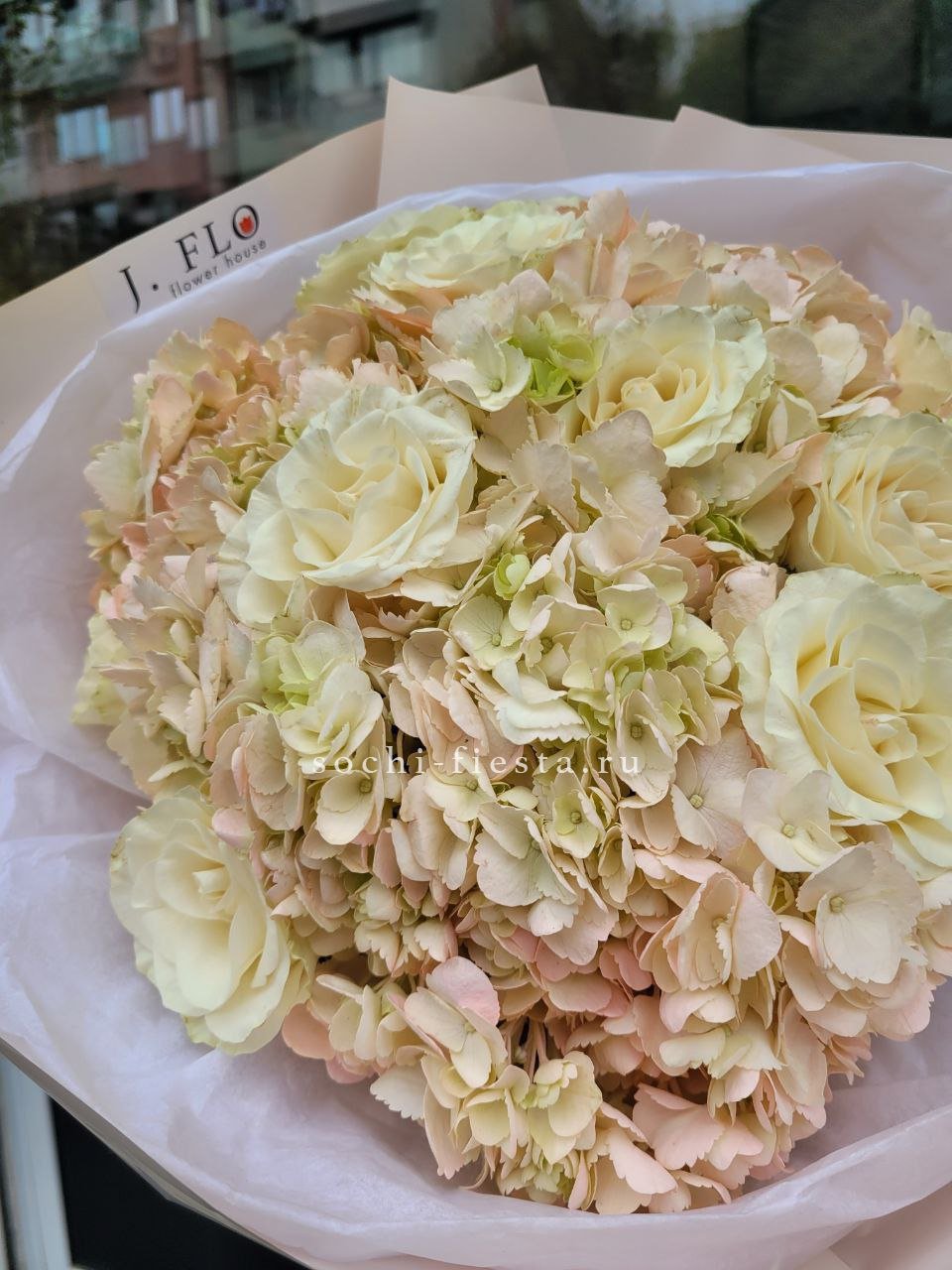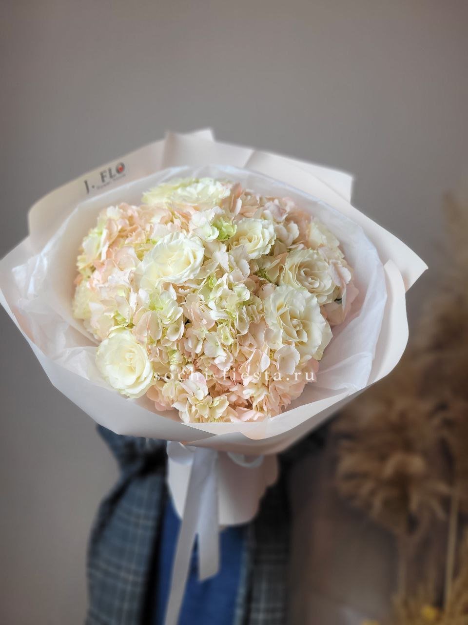 Воздушная гипсофила и струящийся амарантус создают движение вокруг крупных соцветий гортензии и роз Джумилия. Композиция построена на игре объемов и лёгкости линий.