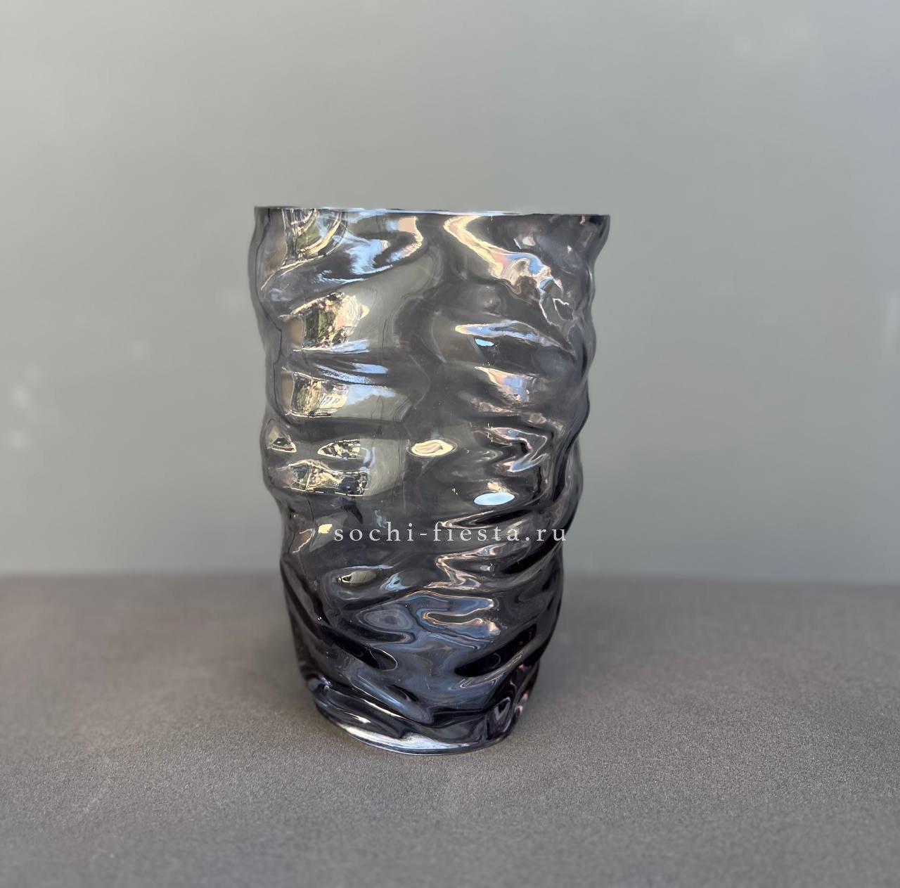 Стеклянная ваза с мятой фактурой и дымчатым оттенком играет со светом и создаёт объём. Её форма хорошо держит как одиночные стебли, так и пышные охапки.