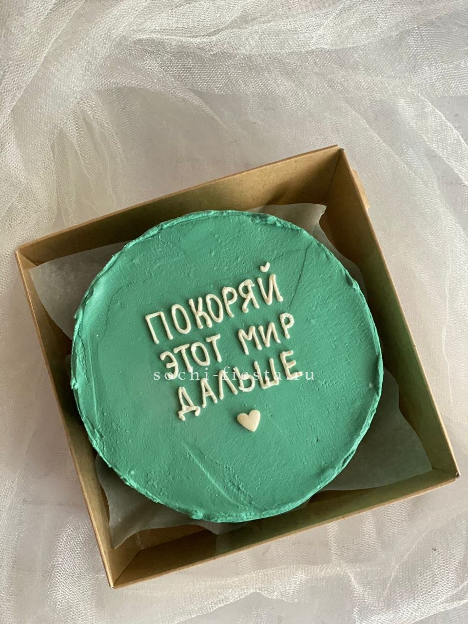 Авторский десерт с вдохновляющим посланием и ярким декором. Каждый торт создаётся вручную, начинка выбирается из двух вариантов, а оформление остаётся неповторимым.