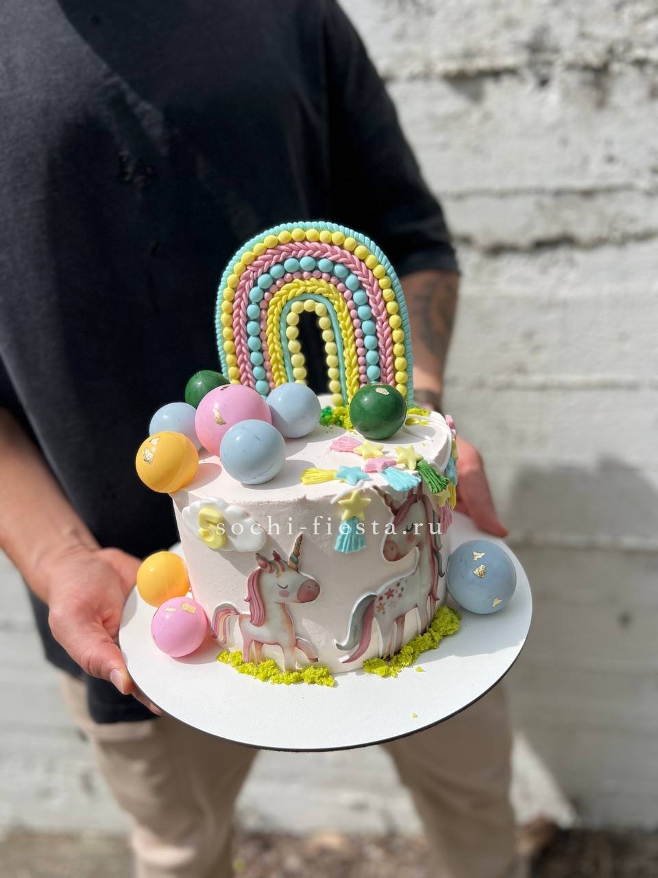 Яркие слои бисквита и крема образуют радужный градиент, а сверху композицию завершает фигурка единорога. Каждый ярус раскрывает новый вкус, превращая угощение в красочное приключение для именинника и гостей.